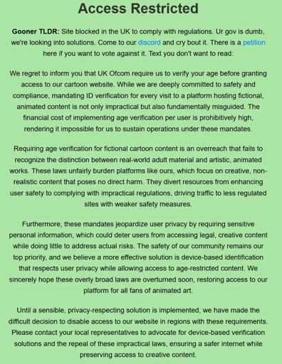 themachinestops@lemmy.dbzer0.com to Technology@lemmy.worldEnglish · edit-23 months agoRule34 blocked the UK entirely rather than comply due to the new law.lemmy.dbzer0.comimagemessage-square94linkfedilinkarrow-up1672arrow-down17