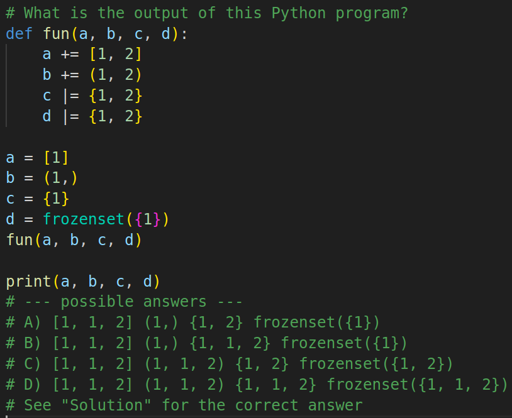 Thanks. I didn’t know: https://memory-graph.com/#code=x+%3D+(0%2C+[1%2C+2]) try%3A ++++x[1]+%2B%3D+[3]++%23+calls+list.__iadd__%2C+then+reassigns+x[1] except+TypeError+as+e%3A ++++print(e) x+%2B%3D+(4%2C)++%23+calls+tuple.__add__%2C+then+reassigns+x print(x) class+MyClass%3A ++++ ++++def+__add__(self%2C+other)%3A ++++++++print(‘__add__’) ++++++++ ++++%23def+__iadd__(self%2C+other)%3A ++++%23++++print(‘__iadd__’) a+%3D+MyClass() b+%3D+MyClass() a+%2B%3D+b++%23+calls+__add__+if+__iadd_+doesn’t+exist &play=