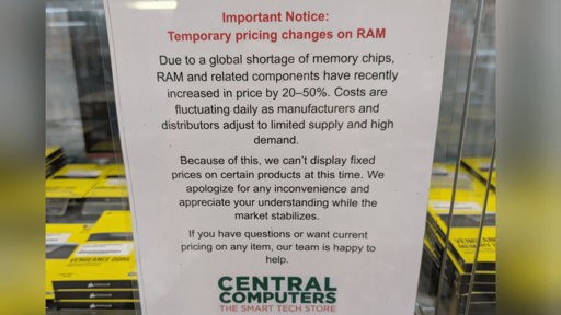 Generative “AI” data centers are gobbling up trillions of dollars in capital, not to mention heating up the planet like a microwave. As a result there’s a capacity crunch on memory production, shooting the prices for RAM sky high, over 100 percent in the last few months alone. Multiple stores are tired of adjusting the prices day to day, and won’t even display them. You find out how much it costs at checkout.
