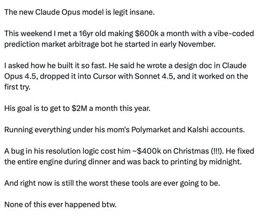 Our Q4 was looking to be slowed down after our CEO lost his voice, limiting his ability to say “AI” a lot, but thanks to our AI capabilities, we used AI to generate an AI voice and AI video of our CEO saying “AI.” Thanks to AI, we’ve finished the year with a valuation 300x the start, according to our AI analyst.
