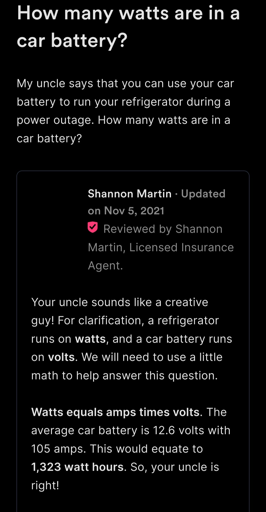 The problem comes when someone takes an answer like this, knowing far less than I do, and they try and hook up their fridge to a car battery.