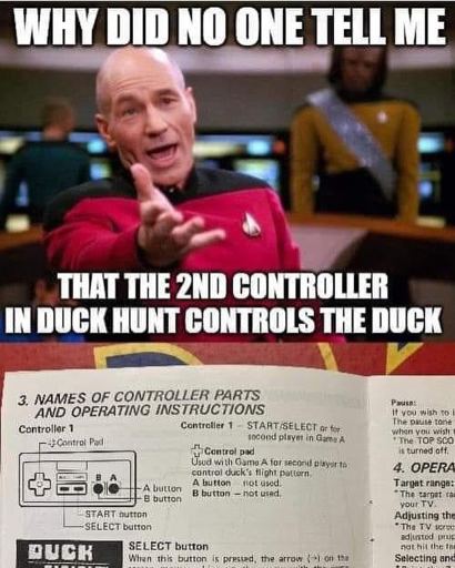 - Found this out completely by accident once after my sister and I played some Mario. - I had the 2nd controller still plugged in, and while shooting the ducks I stepped on the controller and the ducks moved differently. - From the on, every time someone wanted to play duck hunt I would grab a second controller and make it harder for them. - Bonus knowledge: the original game works by a light-sensitive sensor in the blaster tip, and when you pull the trigger, the screen goes black and a white square appears whee the ducks were, in a specific order. If the game controller detects the light square, it counts as a “hit” on whatever duck was in frame. You can cheat by pointing the blaster at a white light and pulling the trigger. It will just go through them one by one as you squeeze, thinking the light is the duck square.