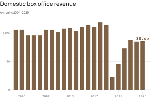 arrow-up110arrow-down1external-link2025 North American box office totaled $8.9 billion in 2025 — up by 2% from 2024, but still well below prepandemic levelsplus-squarewww.nytimes.comnoumenon@lemmy.world to Movies@lemmy.worldEnglish · 9 days agomessage-square1linkfedilink